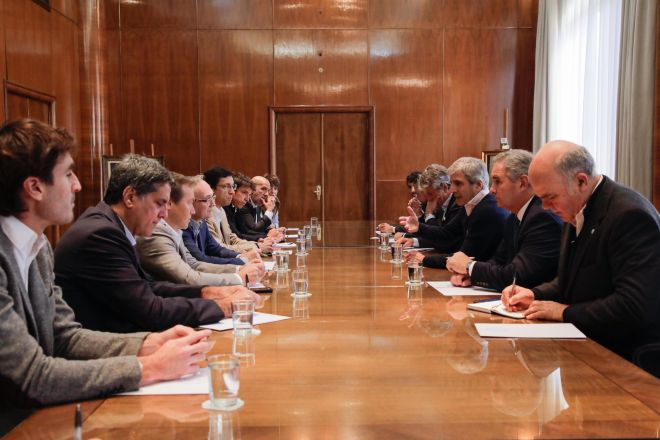 El ministro de Economía, Luis Caputo, encabezó este lunes un encuentro en el Palacio de Hacienda con representantes de la Cámara de la Industria Aceitera de la República Argentina (CIARA), en el cual se dialogó sobre la decisión del Gobierno de eliminar hasta el 31 de octubre las retenciones todos los granos y sus subproductos.